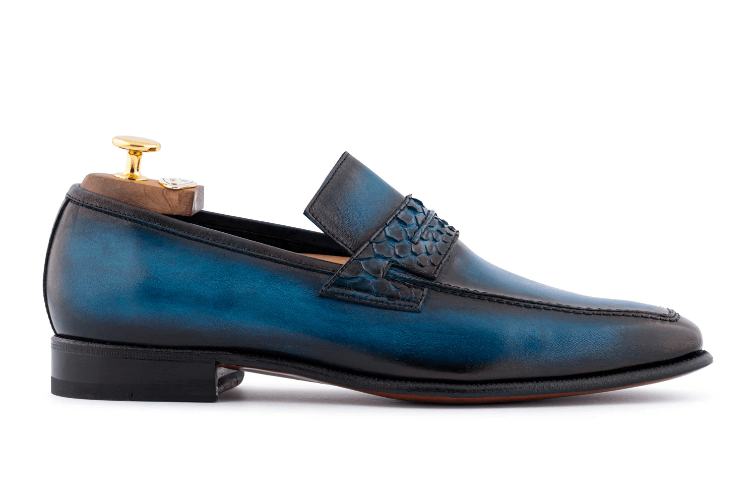 Scarpa in vera pelle di coccodrillo dipinta a mano, color marrone, con dettagli sfumati che ne esaltano la texture unica. Lavorazione Blake rapida, suola in cuoio con inserto in gomma antiscivolo per il massimo comfort e stabilità. Un classico senza tempo, perfetto per chi cerca lusso e artigianalità in ogni dettaglio.
