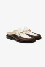Questo mocassino sabot rappresenta la calzatura definitiva per chi non vuole rinunciare alla comodità durante la stagione calda. Caratterizzato dalla caratteristica costruzione tubolare cucita a mano, lo troviamo in questa versione in morbida pelle color ebano. La scocca è realizzata in rafia dalla texture compatta con inserti in pelle bianco latte. La scarpa è realizzata in ottone placcato oro lucido. Il fondo nero è in pelle pantografata, caratterizzata da una sagomatura spigolosa. La fodera è in pelle.