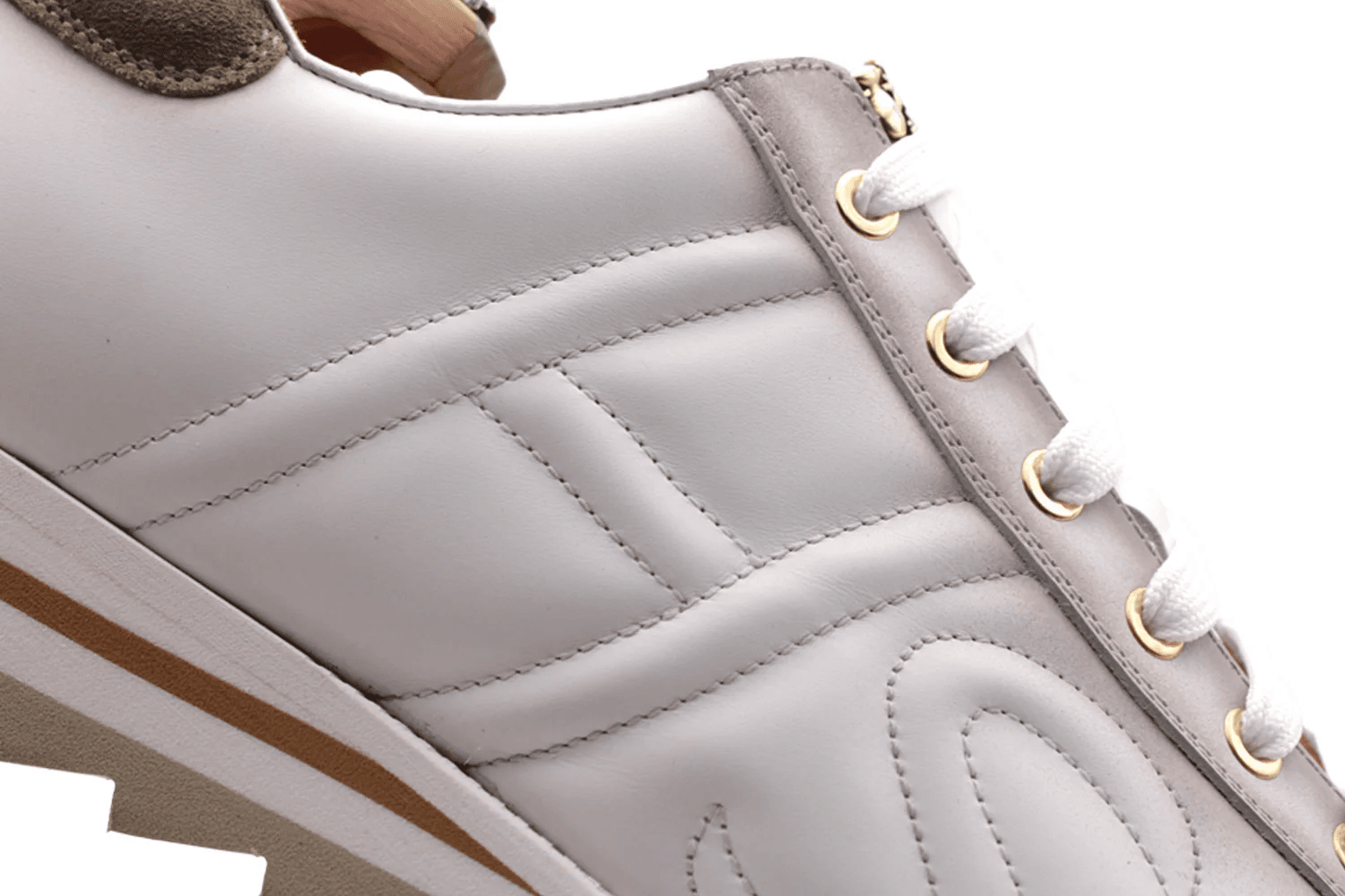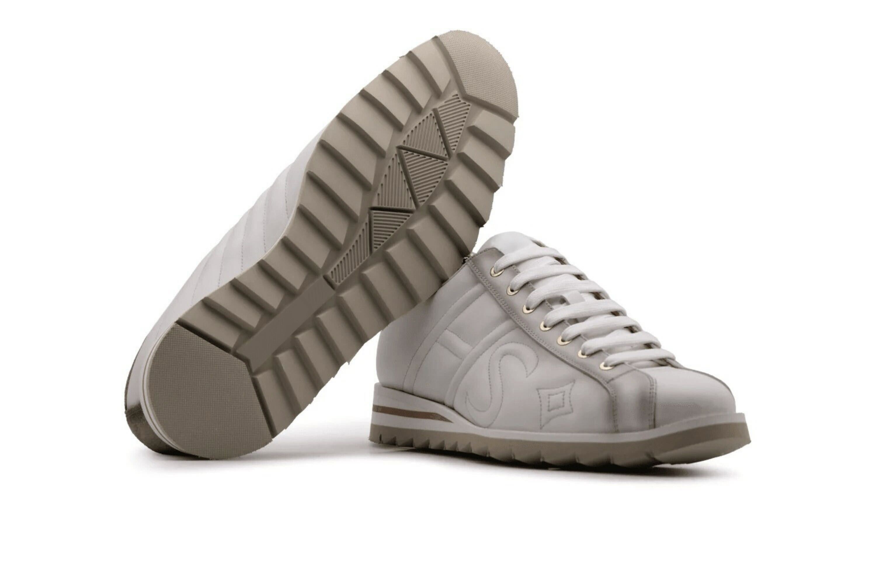 A combination of purity and elegance this Harris sneaker is made of white smooth veal leather, embellished with hand painted shades. The HS logo embroidered laterally testifies to the brand’s identity while the suede details create a refined material contrast. The accessories in gold finish enhance the design with a touch of exclusive brightness while the Runner rubber sole guarantees daily comfort without sacrificing style.